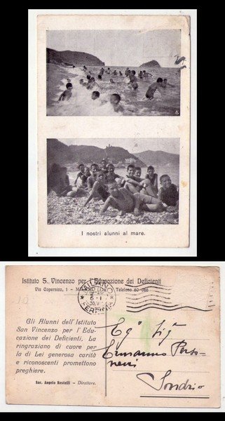 Cartolina Istituto S. Vincenzo per l'Educazione dei Deficienti - Milano "I nostri alunni al mare" 1930