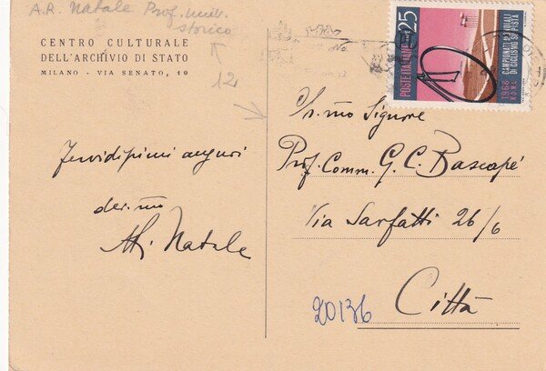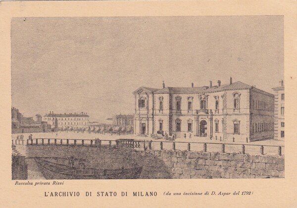 Cartolina L'archivio di Stato di Milano. Spedita da A.R. Natale a Giacomo Carlo Bascapè.