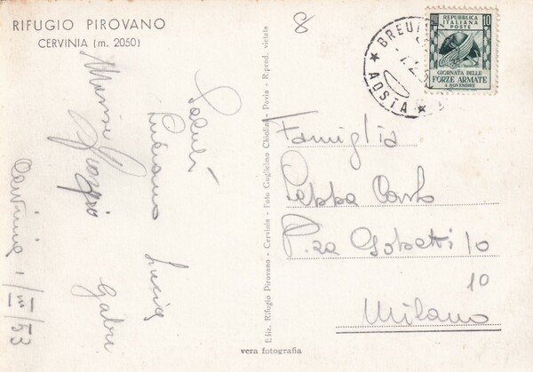 Cartolina La conca di Cervinia - Rifugio Pirovano (Cervinia). 1953