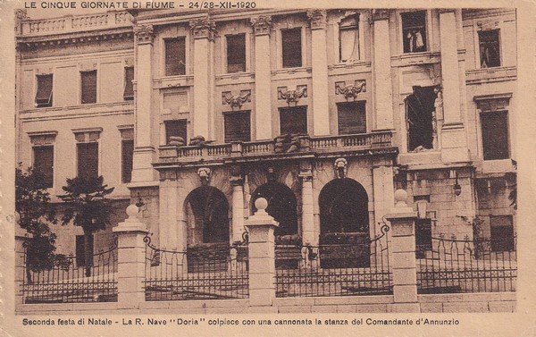Cartolina "Le cinque giornate di Fiume 1920". La R. Nave "Doria" colpisce la stanza di d'Annunzio