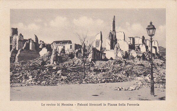 Cartolina Le rovine di MESSINA - Palazzi diroccati in Piazza della ferrovia (Terremoto di Messina 1908)