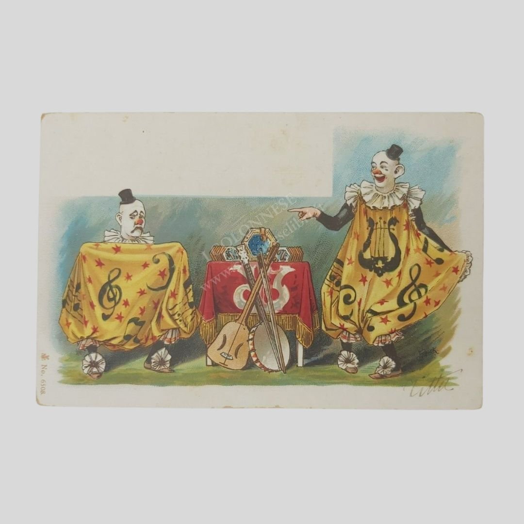 Undivided back. Non Viaggiata, cm 13,9×8,7. Lievi tracce d’uso agli angoli. In buono stato. Molto rara. Due clowns recitano un numero comico-musicale. Hanno enormi vestiti decorati con note musicali, sul tavolino rosso sono appoggiati strumenti musicali: tre organetti, un banjo e una viola con una sola corda.