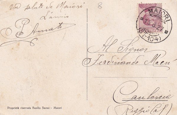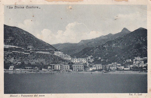 Cartolina Maiori (Salerno) - Panorama dal mare "La Divina Costa". 1927