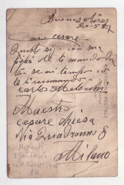 Cartolina migranti italiani in Argentina. Transatlantico Giulio Cesare - Genova. 1929 ca.