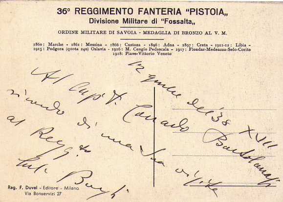 Cartolina Militare 36°Reggimento Fanteria PISTOIA - Divisione FOSSALTA 1938