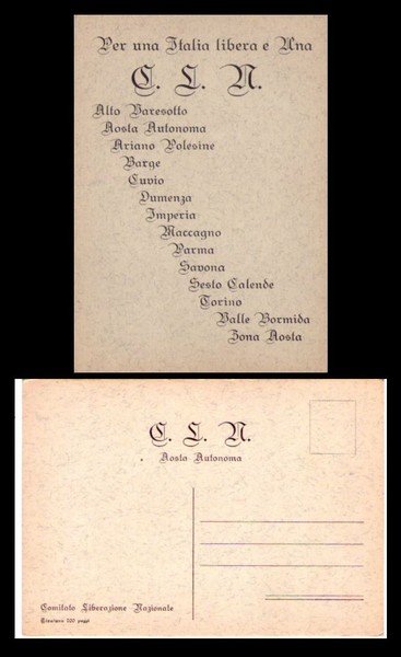 Cartolina Militare Partigiana COMITATO LIBERAZIONE NAZIONALE Aosta Autonoma - Tiratura 700 pezzi