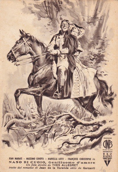 Cartolina "Naso di cuoio, Gentiluomo d'amore" con Jean Marais, Françoise Christophe, Mariella Lotti, Massimo Girotti.