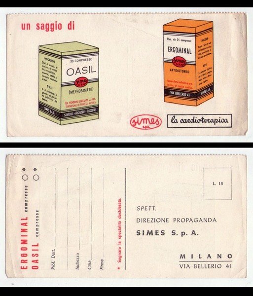 Cartolina OASIS (meprobamato) - ERGOMINAL (antidistonico). SIMES la cardioterapica.