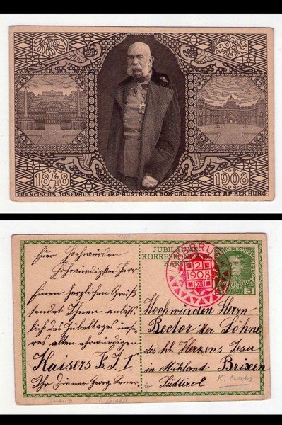 Cartolina / postcard Anniversario Francesco Giuseppe I d'Austria. Incisione K. Moses. 1908
