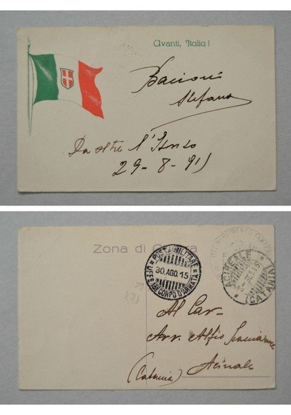 Cartolina / postcard da Zona di Guerra "Avanti, Italia!" (tricolore) Ufficio 13°Corpo d'Armata. 1915