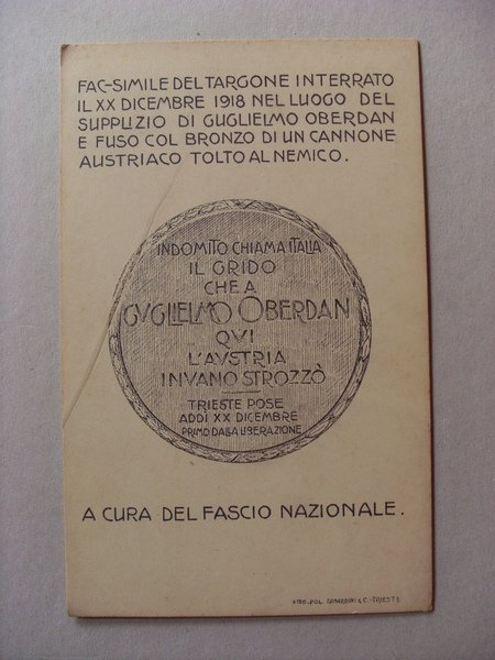 Cartolina / postcard Fac - simile targone interrato 1918 nel luogo del supplizio di Guglielmo Oberdan. Fascio Nazionale