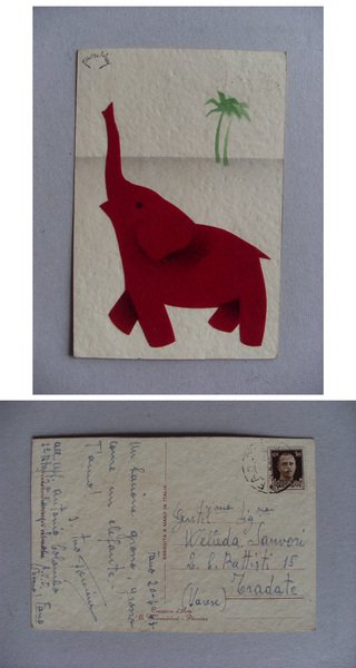 Cartolina / postcard illustrata con panno lenci ELEFANTE. Marandolani - Piacenza. 1943