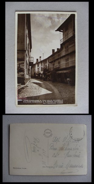 Cartolina / postcard Vico Canavese (Torino) Valle Chiusella - Palazzo Comunale e Albergo Universo all'ingresso del paese. 1936