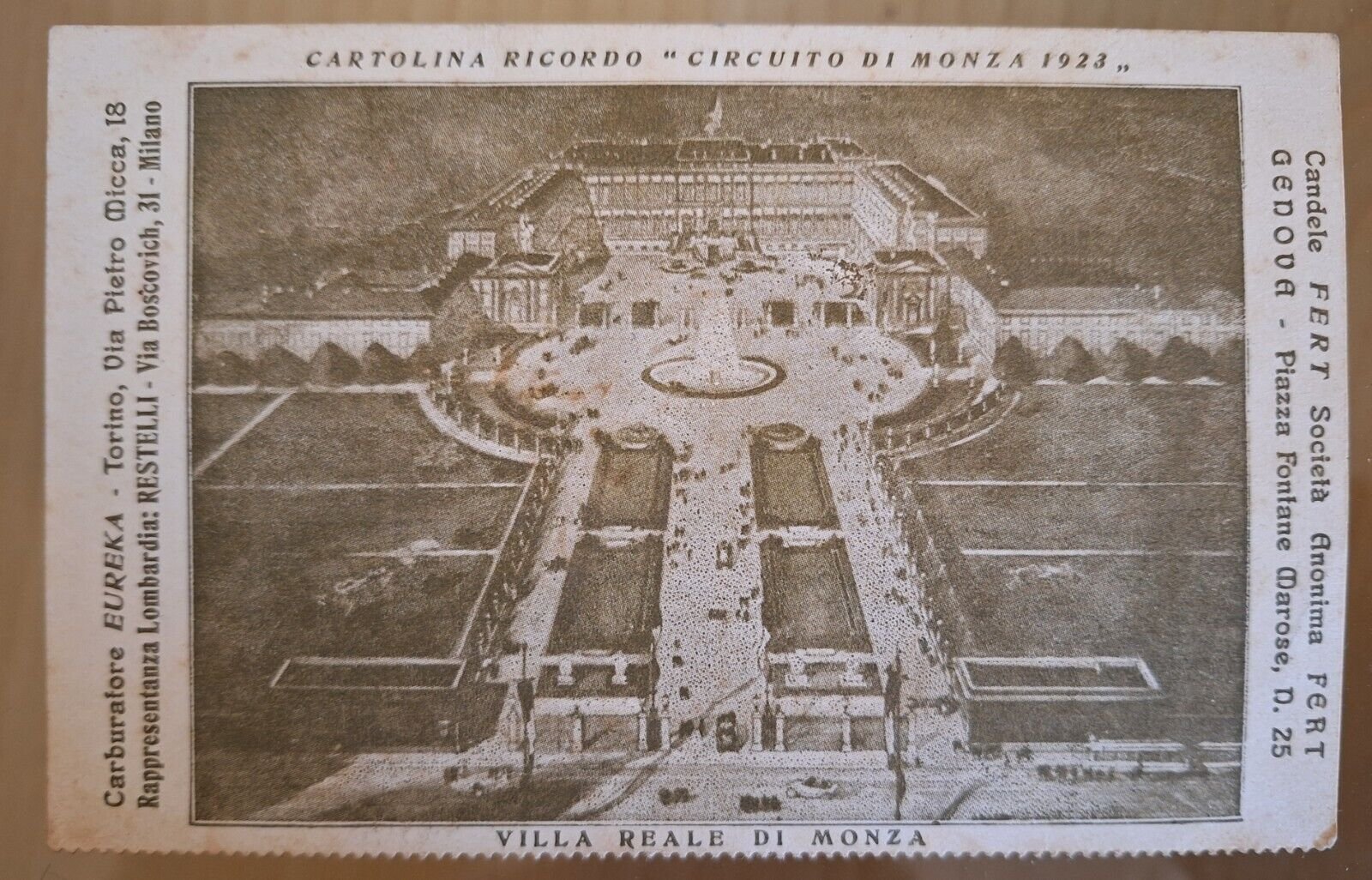 CARTOLINA RICORDO CIRCUITO DI MONZA 1923 VILLA REALE DI MONZAIn b/n, al margine pubblicita' del carburatore eureka e candele fertLievissimi segni del tempo.