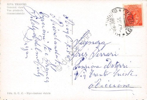 Cartolina Riva Trigoso panorama e spiaggia ferrovia 1955 | Cartoline |