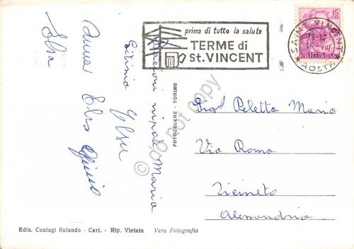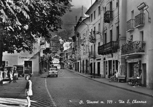 Cartolina Saint Vincent Via Chanoux animata auto 1961 timbro Terme