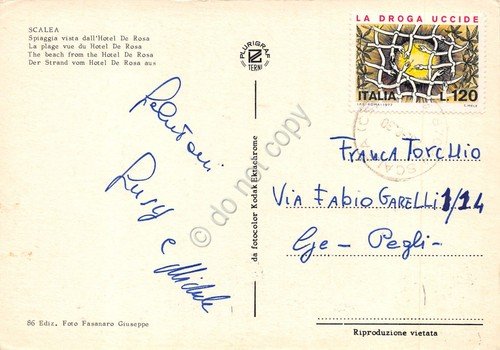 Cartolina Scalea spiaggia vista da Hotel De Rosa piscina 1980