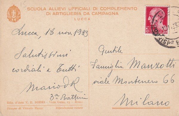 Cartolina Scuola Allievi Ufficiali di Complemento Artiglieria da Campagna. LUCCA. Vittorio Pisani 1933