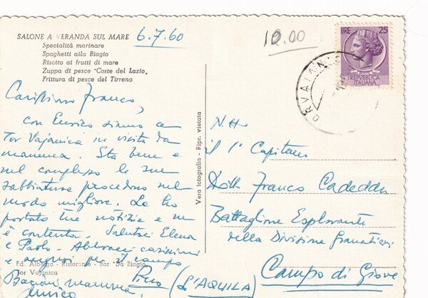 Cartolina Tor Vajanica (Torvaianica) - Ristorante "Da Biagio". 1960
