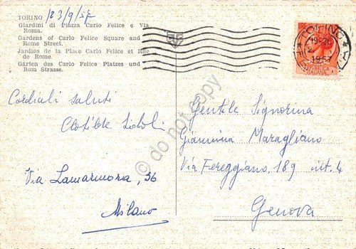 Cartolina Torino Giardini Piazza Carlo Felice Via Roma illustrata