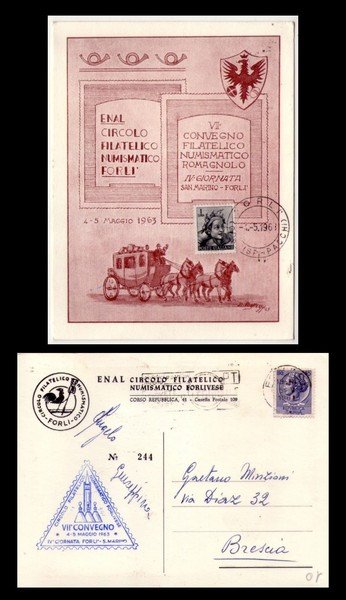Cartolina VII°Convegno filatelico numismatico romagnolo. IV° giornata San Marino - Forlì. 4-5 maggio 1963