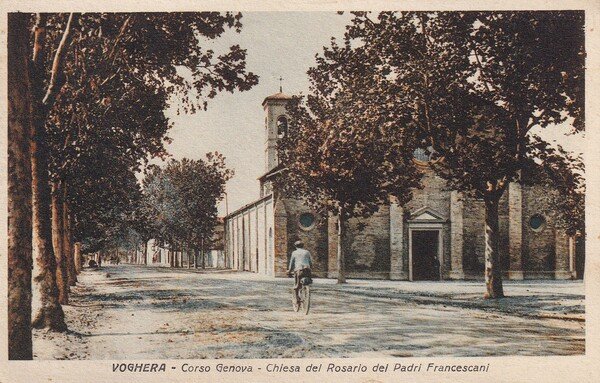 Cartolina Voghera (Pavia) - Corso Genova - Chiesa del Rosario dei Padri Francescani. 1930