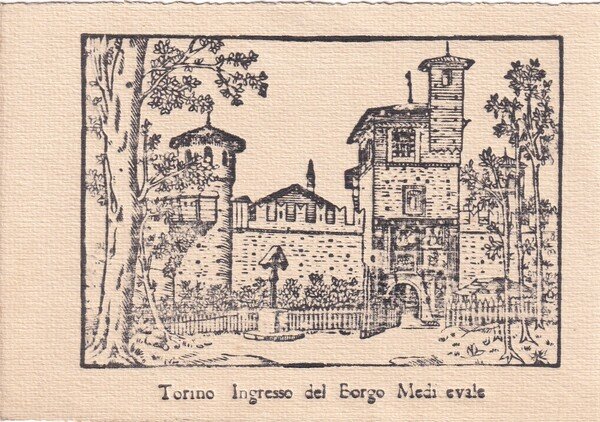 Cartolina xilografica Torino ingresso del Borgo Medievale.