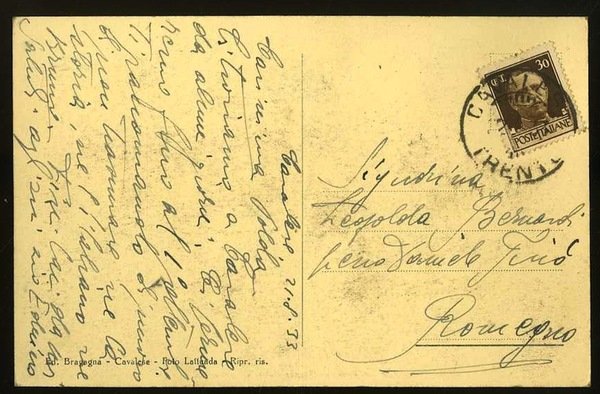 Cartolina fotografica in bianco e nero di misure 14,1x9,1 cm. Condizioni : USATO - Stato : Buono, ordinari segni d'uso e del tempo. Altre note : Viaggiata con francobollo e timbro di annullo di Cavalese.
