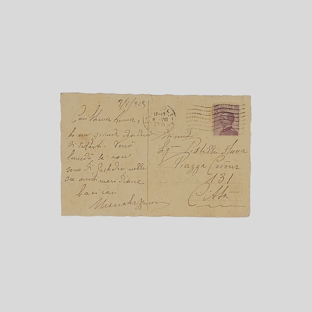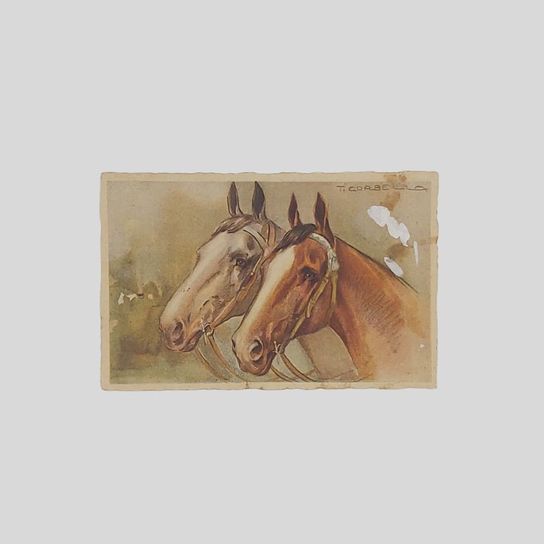 Cavalli. Cartolina d’epoca , bordi ondulati. Viaggiata, invio del 8/8/1929, cm 14×9. Francobollo, timbro. Tracce d’uso, residui di “bianchetto” al recto.