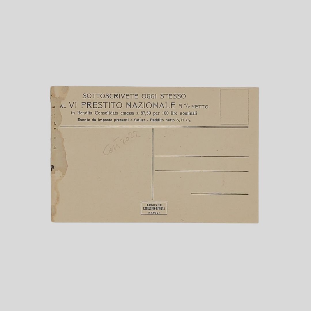cm 9x14. Cartolina non viaggiata.Tracce d'uso. Il VI prestito nazionale al 5% netto, venne deliberato nel 1918 dopo la vittoria del Piave. Lo scopo del prestito era di recuperare le spese di guerra fino allora sostenute. La sottoscrizione venne avviata nel 1920, è dunque tra questi anni va collocata la stampa della cartolina.