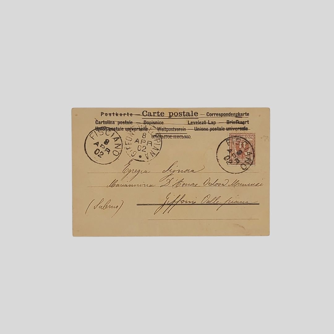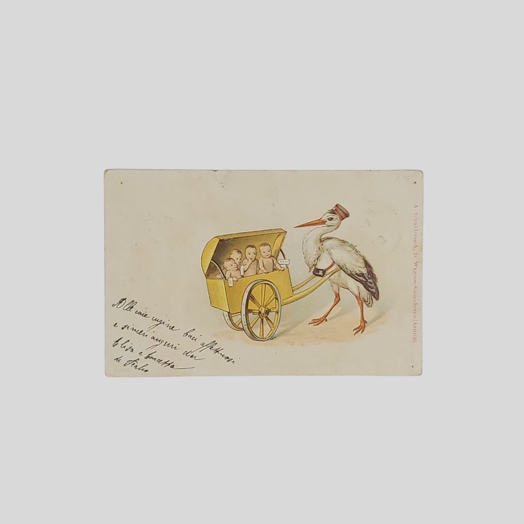 Cartolina augurale d’epoca. Undivided back. Viaggiata. Austria. A. Schwidernoch, D. Wagram -Sussenbrun, cm 14×9. Francobollo, timbri (8/4/1902). Tracce d’uso agli angoli e alone del timbro al recto.