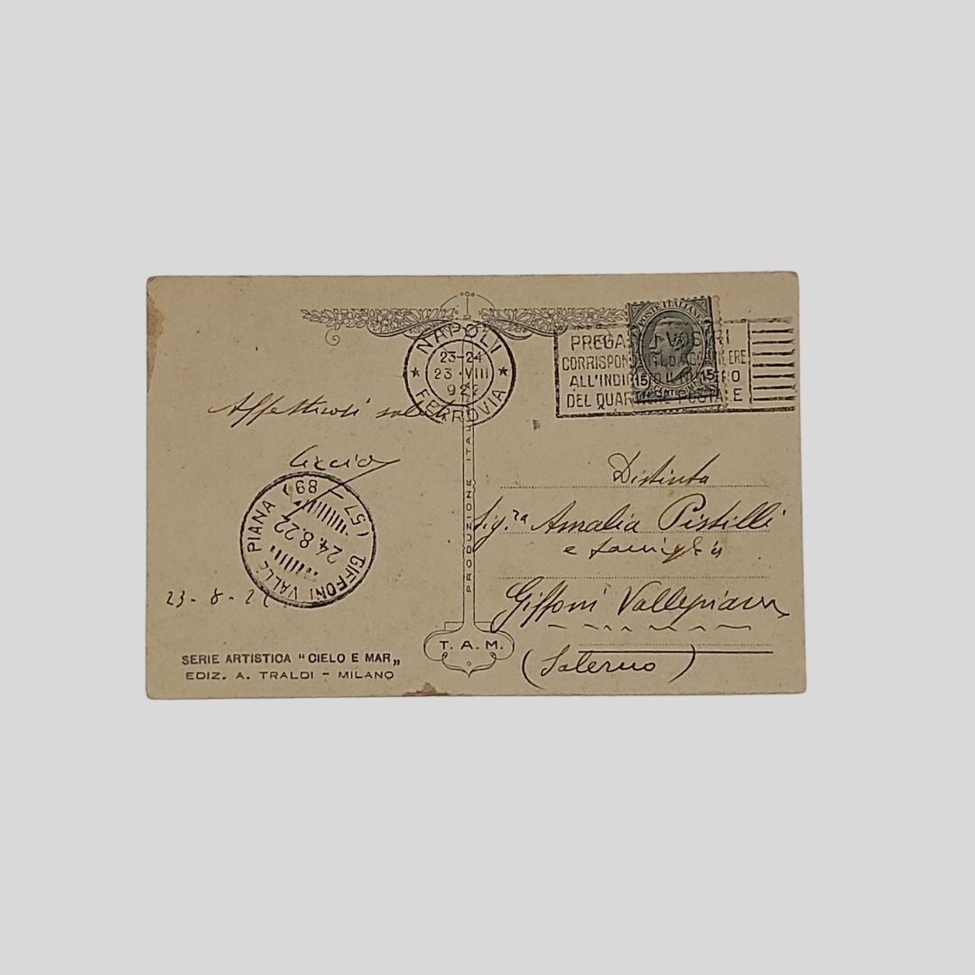 Cartolina d’epoca. Viaggiata, invio del 23/8/1922, cm 14X9. Francobollo, timbri. Lievi tracce d’uso al verso. Serie Artistica.