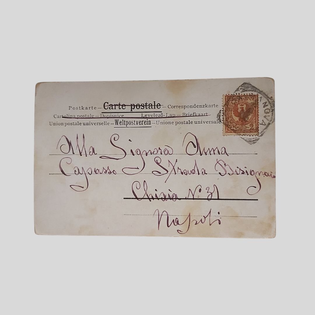 Cartolina undivided back, primi ‘900, cm 14×9. Viaggiata. Tracce d’uso agli angoli e ai margini, piegolina più insistente all’angolo inferiore sinistro. Rara.