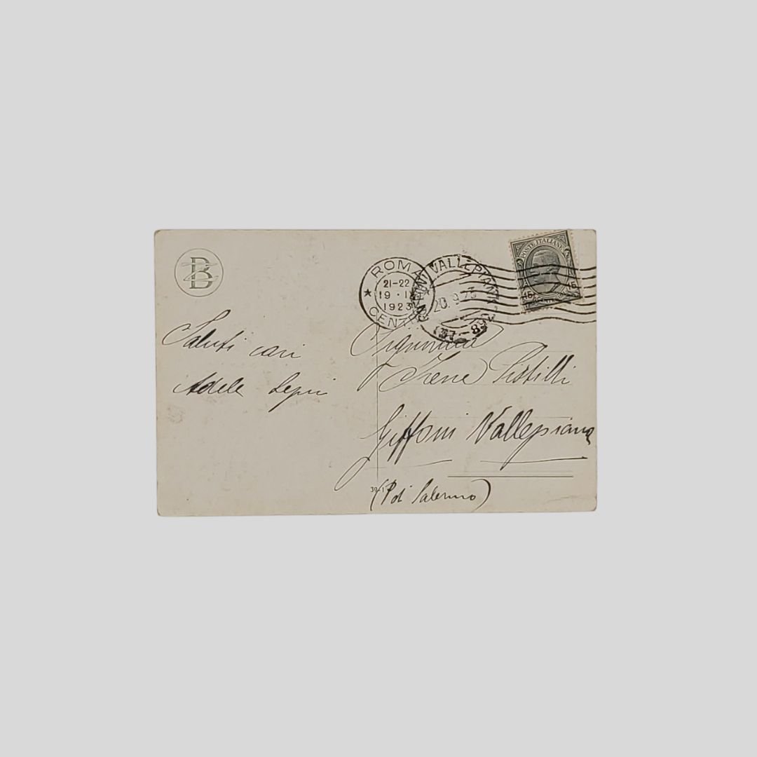 Cartolina d’epoca. Viaggiata, cm 9×14. Francobollo, timbri (19/9/1923). Tracce d’uso agli angoli. Non comune.