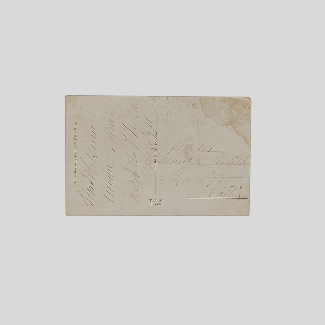 Cartolina d’epoca. Non viaggiata, ma con invio di mano sincrona datata Marzo 1921. Tracce d’uso al recto-verso.