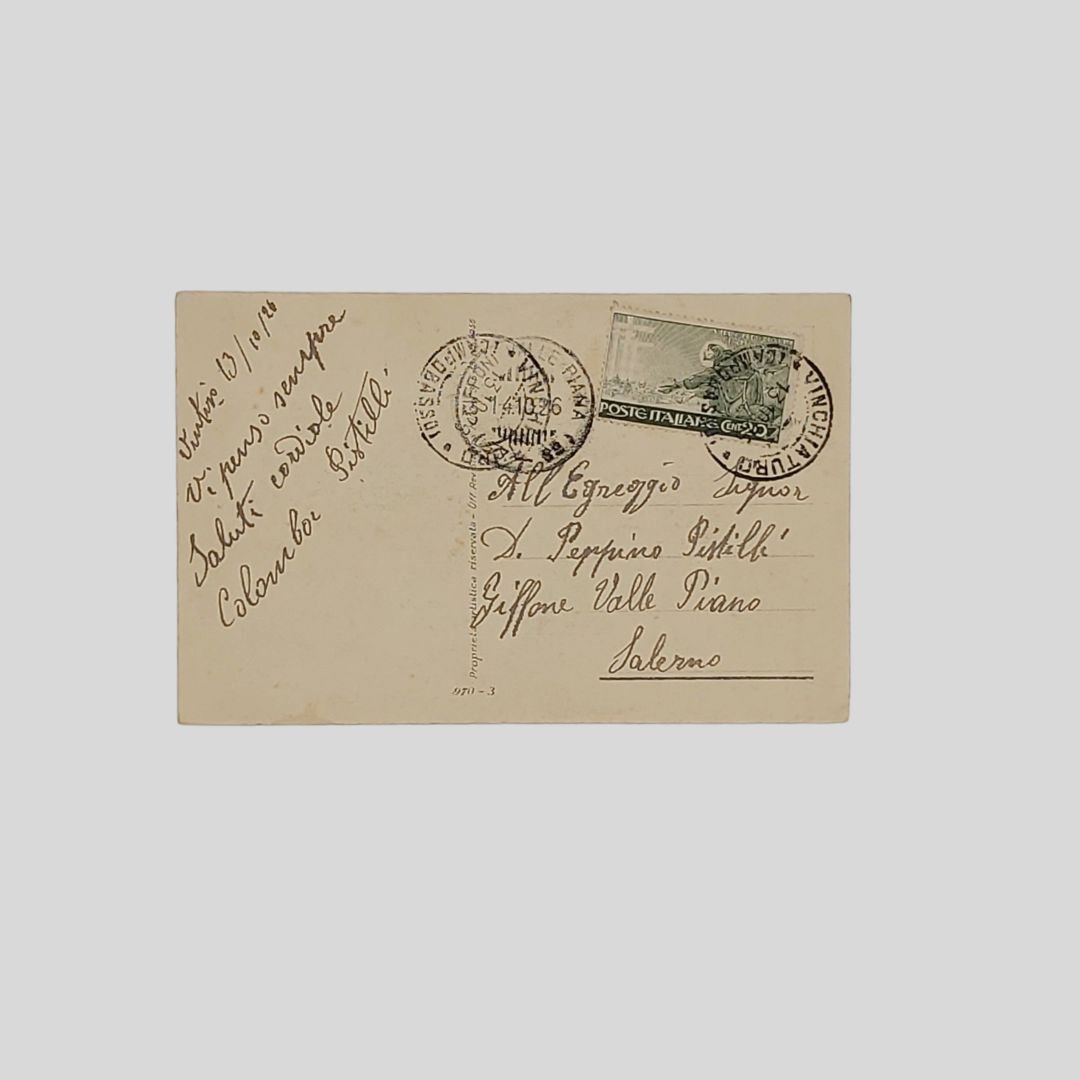 Cartolina d’epoca . Viaggiata, invio del 13/10/1926, cm 14×9. Francobollo, timbri. Lievi tracce d’uso. Serie 970-3