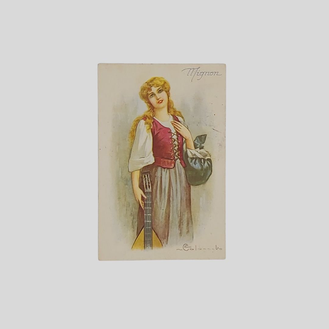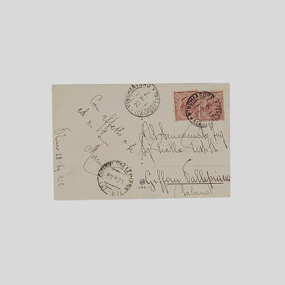 Cartolina d’epoca. Viaggiata, invio del 28/8/1925, cm 9×14. Francobolli, timbri. Lievi tracce d’uso. In buone condizioni. Non comune. Serie Mignon n. 1689-1