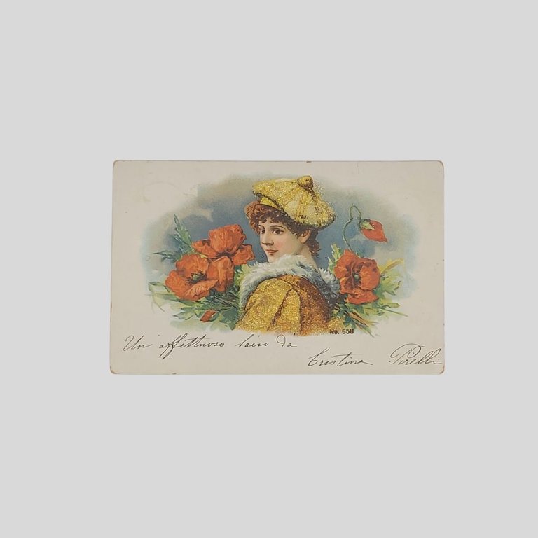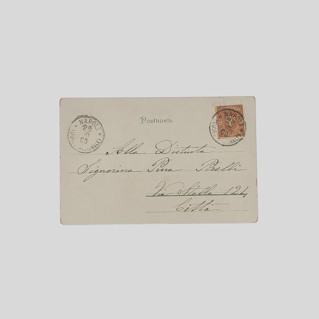 Cartolina goffrata d’epoca. Undivided back. Viaggiata, s.d. (fine ‘800), cm 14×9. Francobollo, timbri (20/10/1900). Lievi tracce d’uso agli angoli.<BR><BR>