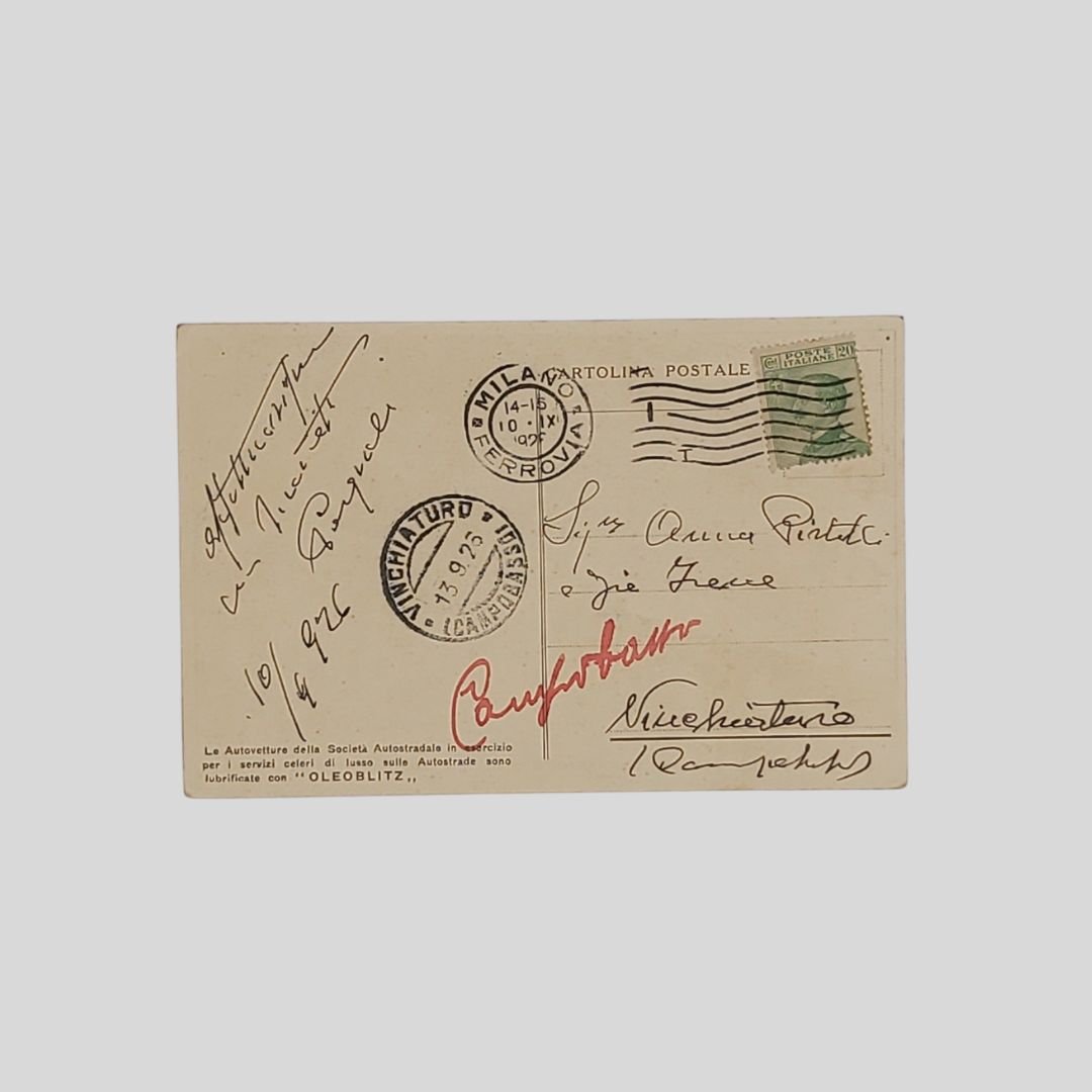 cm 14×9. Cartolina pubblicitaria d’epoca. Viaggiata. Timbri e francobollo. Invio del 10/9/1926. In buone condizioni. Rara.
