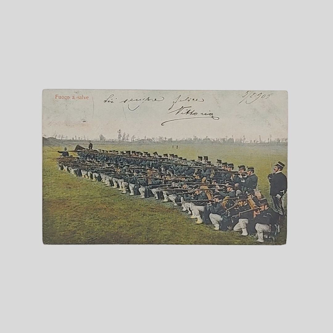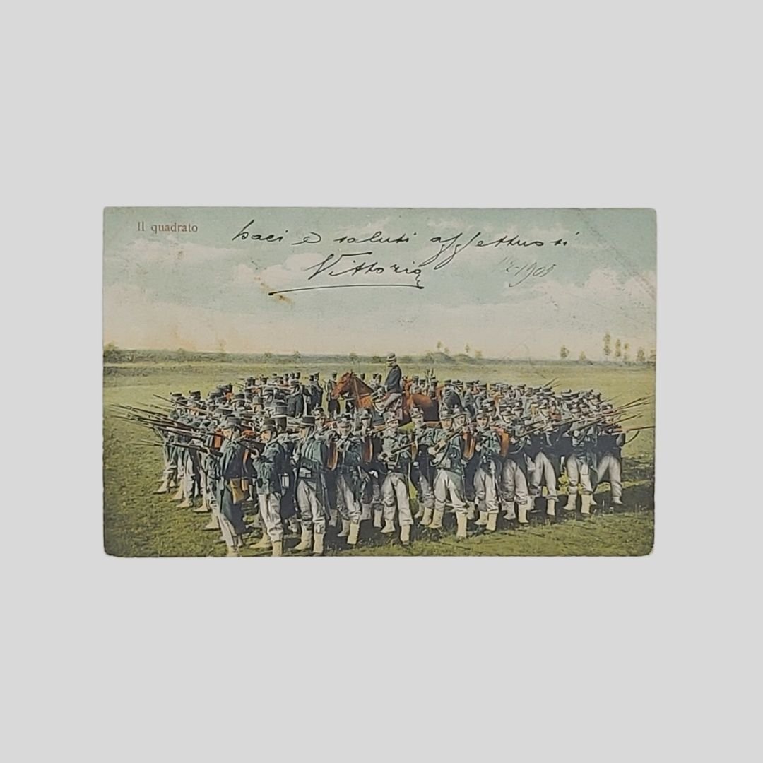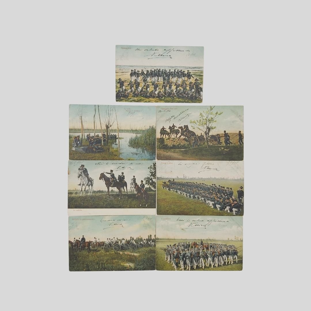 Undivided back, cm 14x9. Viaggiate con francobolli, postalizzate tra il 1904 e il 1907. Naturali tracce d’uso agli angoli. Esercitazioni e tattica militare dei reparti di Artiglieria pesante, Cavalleria, Bersaglieri, Fanteria del regio esercito (tra parentesi il numero di serie): 1. Passaggio d’ostacoli (566. 7). 2. Catena fitta (567. 5). 3. Fuoco a Salve (567. 4). 4. Batteria in ammassamento (565. 5). 5. Il Quadrato (566. 4). 6. In vedetta (567. 1). 7. Fanteria, Pattuglia in appostamento (957. 1).