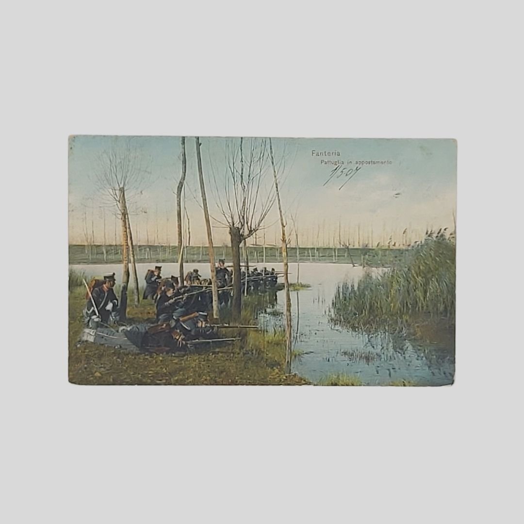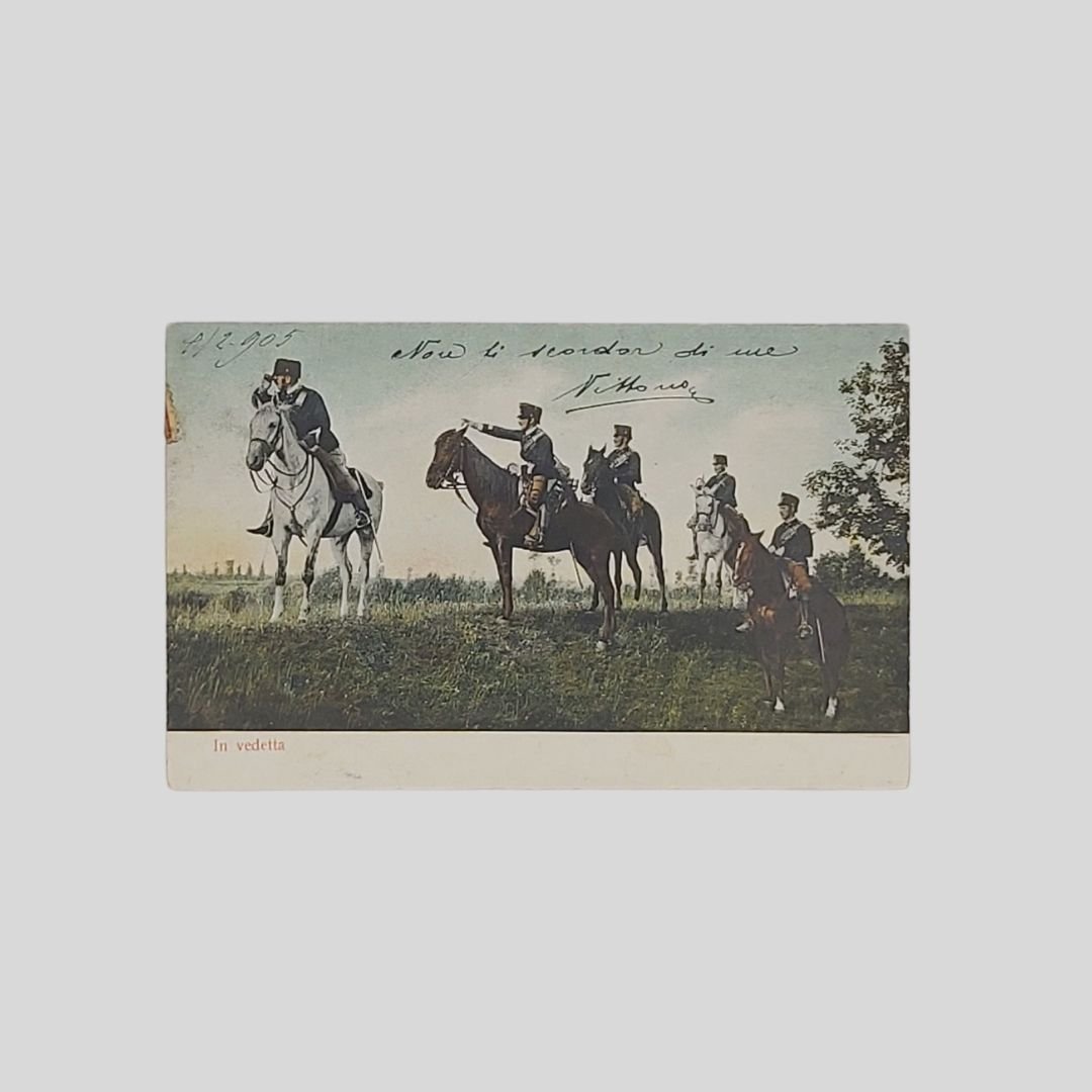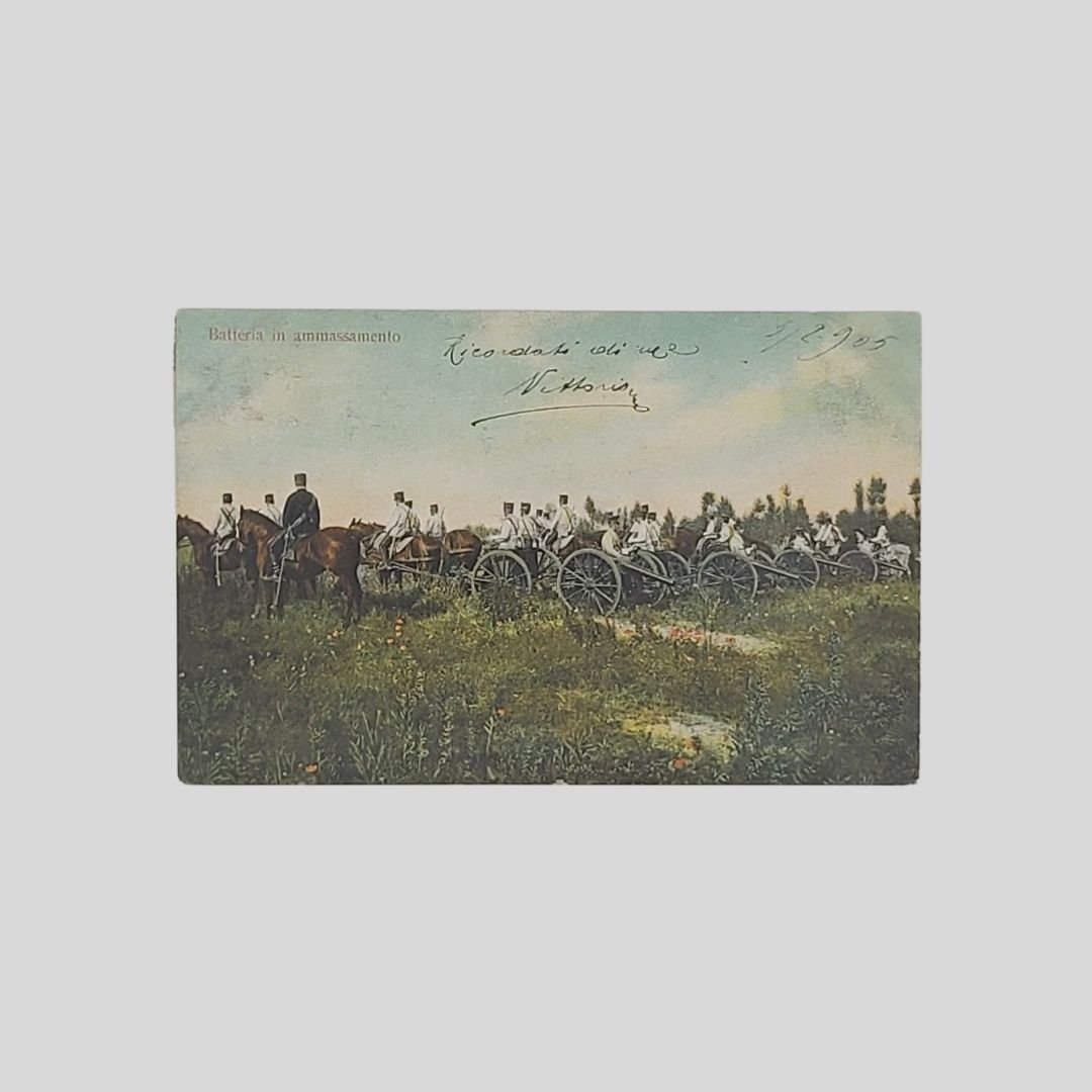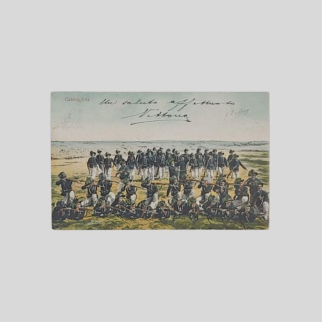 Undivided back, cm 14x9. Viaggiate con francobolli, postalizzate tra il 1904 e il 1907. Naturali tracce d’uso agli angoli. Esercitazioni e tattica militare dei reparti di Artiglieria pesante, Cavalleria, Bersaglieri, Fanteria del regio esercito (tra parentesi il numero di serie): 1. Passaggio d’ostacoli (566. 7). 2. Catena fitta (567. 5). 3. Fuoco a Salve (567. 4). 4. Batteria in ammassamento (565. 5). 5. Il Quadrato (566. 4). 6. In vedetta (567. 1). 7. Fanteria, Pattuglia in appostamento (957. 1).