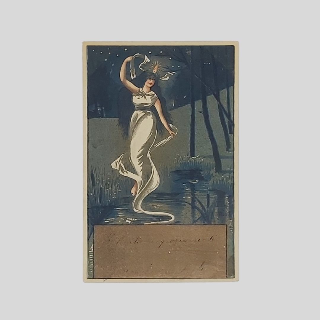 mm 142×92. Francobollo e doppio timbro, postalizzata il 3/10/1902. In ottime condizioni. Rara. Con indicazione al verso: «Esponete la cartolina per qualche minuto alla luce del giorno e guardatela allo scuro». Bello e raro esempio di cartolina Art Nouveau phosphorescentes: una parte dell’immagine veniva trattata con una vernice speciale, solitamente a base di solfuro di zinco o solfuro di calcio, che si “caricava” alla luce e poi brillava al buio.