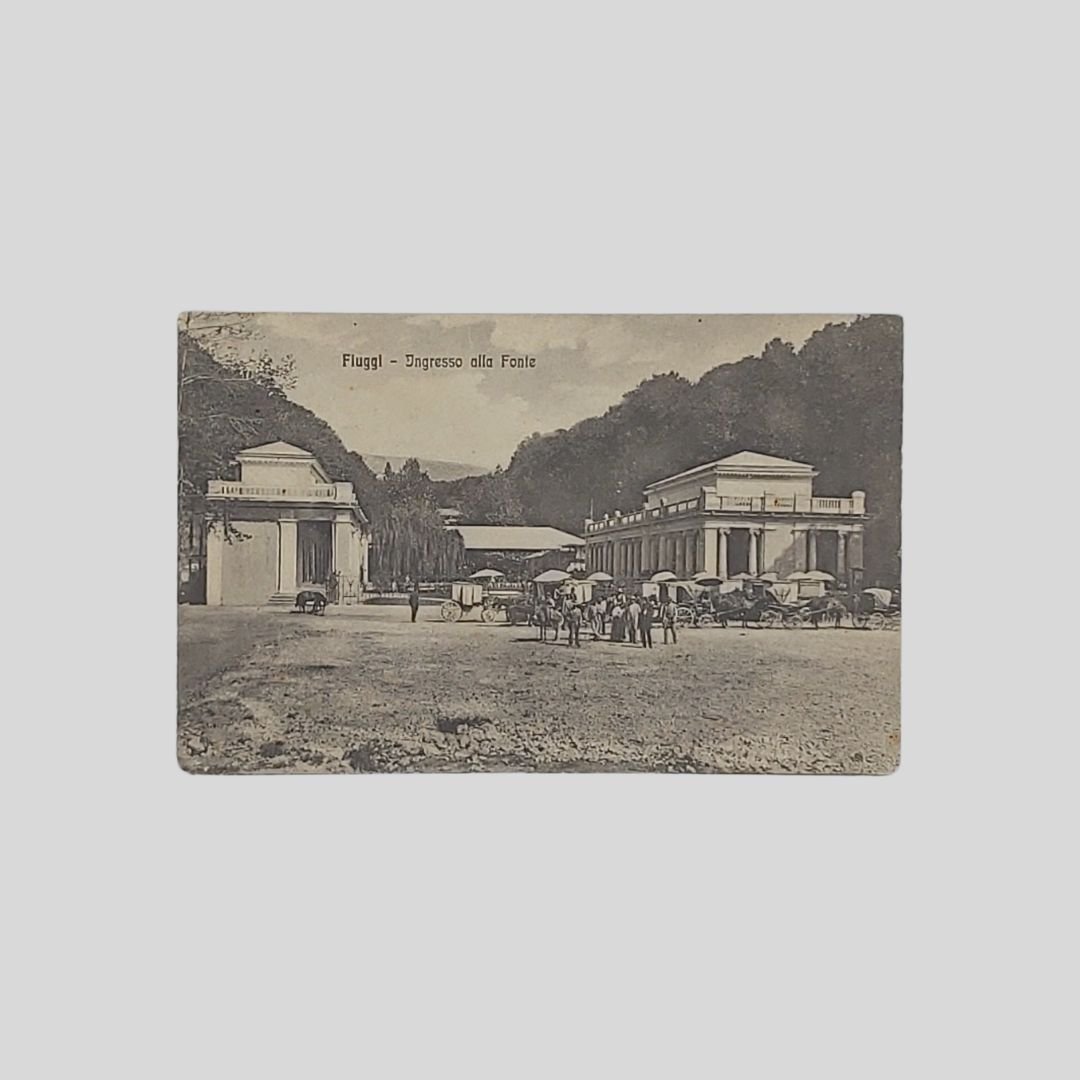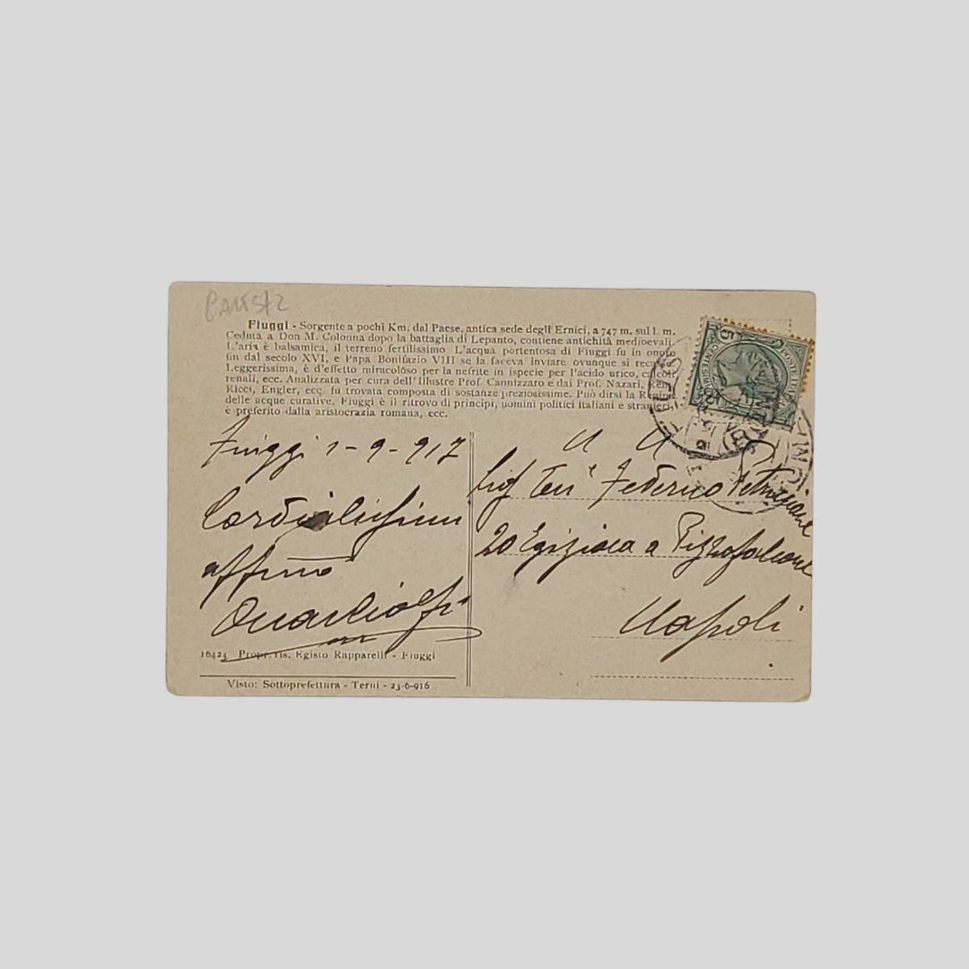 cm cm 13,5×8,5. Cartolina fotografica originale, francobollo, timbri, datata 1-9-1917. Animata con carrozze in primo piano. Tracce d’uso agli angoli. Sorgente a pochi Km., dal paese antica sede degli Ernici.<BR><BR>