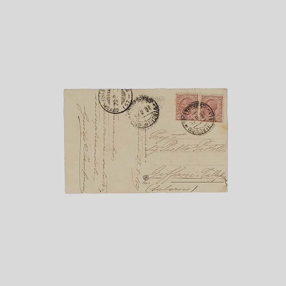 Cartolina d’epoca con bordi ondulati. Viaggiata, invio del 27/8/1925, cm 9×14. Francobolli, timbri. Lievi tracce d’uso. Rara. Serie 1924-4