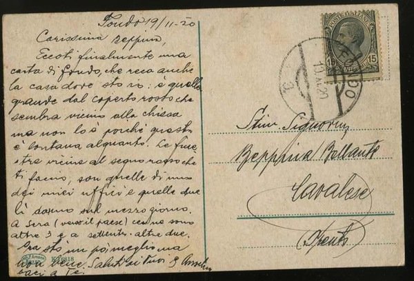 Cartolina a colori di misure 13,7x9 cm. Condizioni : USATO - Stato : Buono, ordinari segni d'uso e del tempo. Altre note : Viaggiata con francobollo e timbro di annullo di Fondo.
