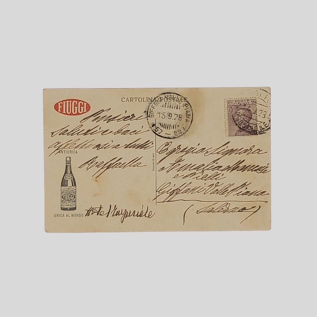 Cartolina fotografica originale viaggiata, s.d., (anni ’20), cm 9×14, timbri, francobollo, postalizzata 15/9/1928. Tracce d’uso.