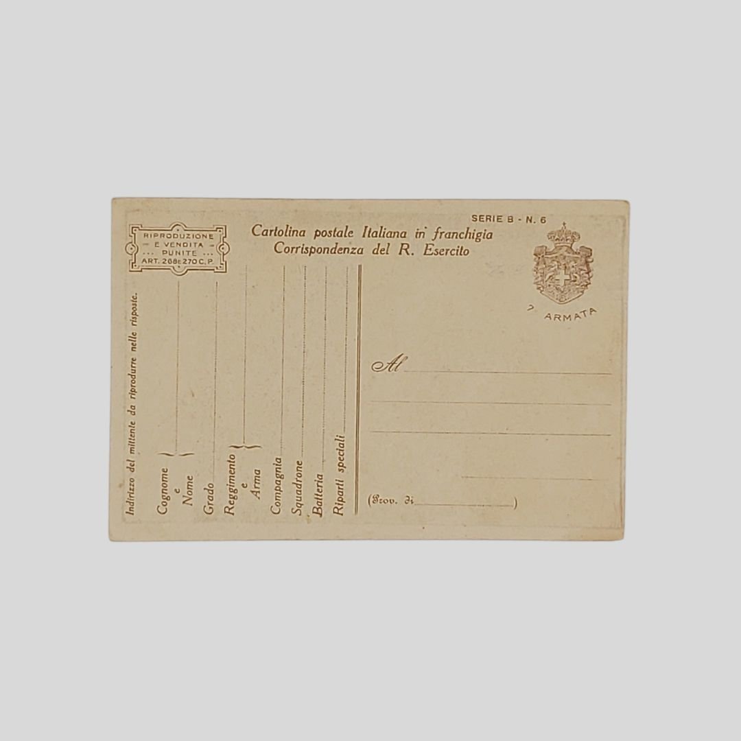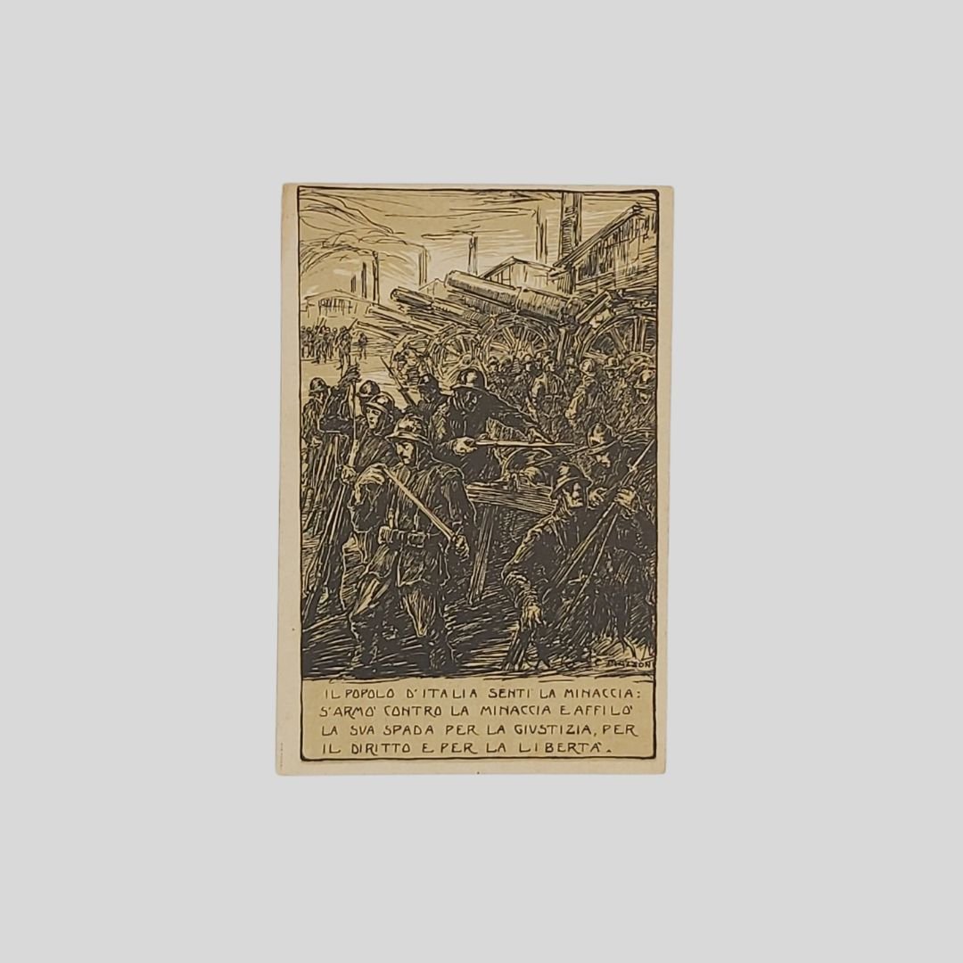 Cartolina in franchigia del R. Esercito. Non viaggiata, 1918, cm 9×14. In buone condizioni. Prima guerra mondiale. Soldati italiani, cannoni e fabbriche.Il popolo d’Italia sentì la minaccia: s’armò contro la minaccia e affilò la sua spada per la giustizia, per il diritto e per la libertà. Giuseppe Mazzoni [Modena 1881 – Genova 1957]. Pittore e illustratore. Si iscrive nel 1895 al Regio Istituto di Belle Arti di Modena, diplomandosi nel 1901 in Pittura e Decorazione sotto la guida di Alfredo Tartarini. Pittore e illustratore soprattutto di soggetti militari per numerose riviste e cartoline. Dal 1918 collabora con disegni al settimanale milanese “L’Illustrazione Italiana”. Nella primavera del 1923 partecipa alla Quadriennale di Torino, Esposizione Nazionale di Belle Arti, con il dipinto: Policromia Ligure (tempera). [cfr. Dizionario d’Arte Sartori]