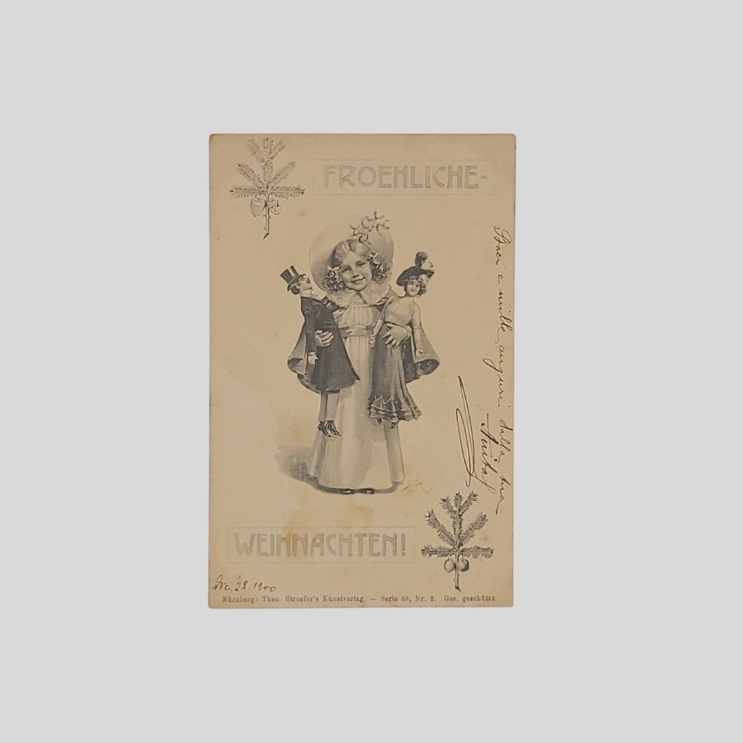 cm 9x14. Cartolina d’epoca. Undivided back. Viaggiata, invio del 23/12/1900. Francobollo, timbro. Lievi Tracce d’uso. Auguri di Buon Natale: bambina che stringe bambole raffiguranti i genitori. Serie 68, Nr. 2. Theodor Zasche (Vienna 1862-ivi 1922) è stato un pittore, caricaturista e illustratire di cartoline. Figlio del pittore Josef Zasche, si formò con il padre e in seguito studiò alla Scuola di Arti Applicate di Vienna sotto la guida di Ferdinand Laufberger e Julius Victor Berger . Dopo la morte del padre, continuò il suo laboratorio di pittura su porcellana e si cimentò anche nella pittura a pastello. Zasche ha lavorato come illustratore per numerose riviste a Vienna, Berlino e Monaco. Appassionato conoscitore della vita e della società viennese, lavorò per il quotidiano Volkszeitung dal 1910 in poi, coltivando la satira politica. Nei suoi disegni a penna e inchiostro, raggiunse la precisione del ritratto con una forte caratterizzazione e umorismo con pochi tratti. Dal 24 marzo 1892 fu membro del Künstlerhaus di Vienna. Il 14 ottobre 1902 viene menzionato come partecipante ad un breve volo di poco meno di 2 ore con il pallone “Jupiter”, al quale parteciparono anche Herbert Silberer ed Emile Carton.