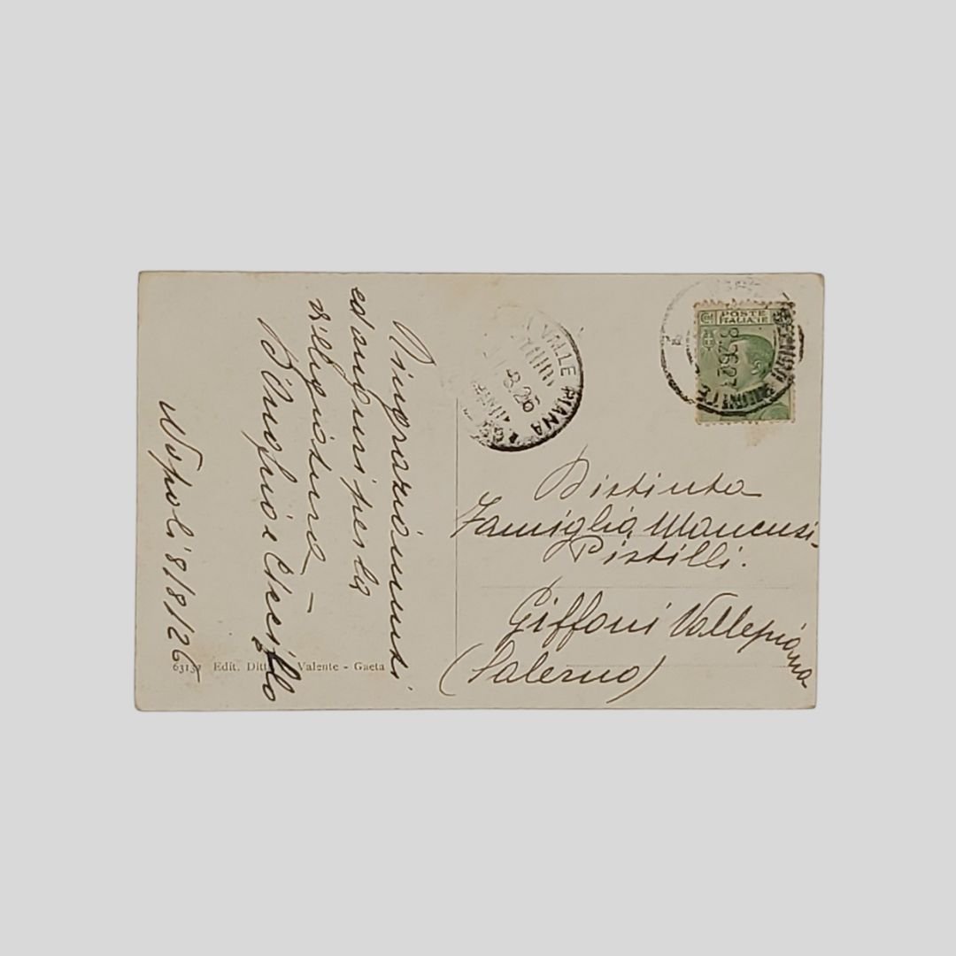 cm 13,7×8,8. Cartolina fotografica originale viaggiata, timbri, francobollo. Datata 8/8/1926. Traccia d’uso all’angolo destro.