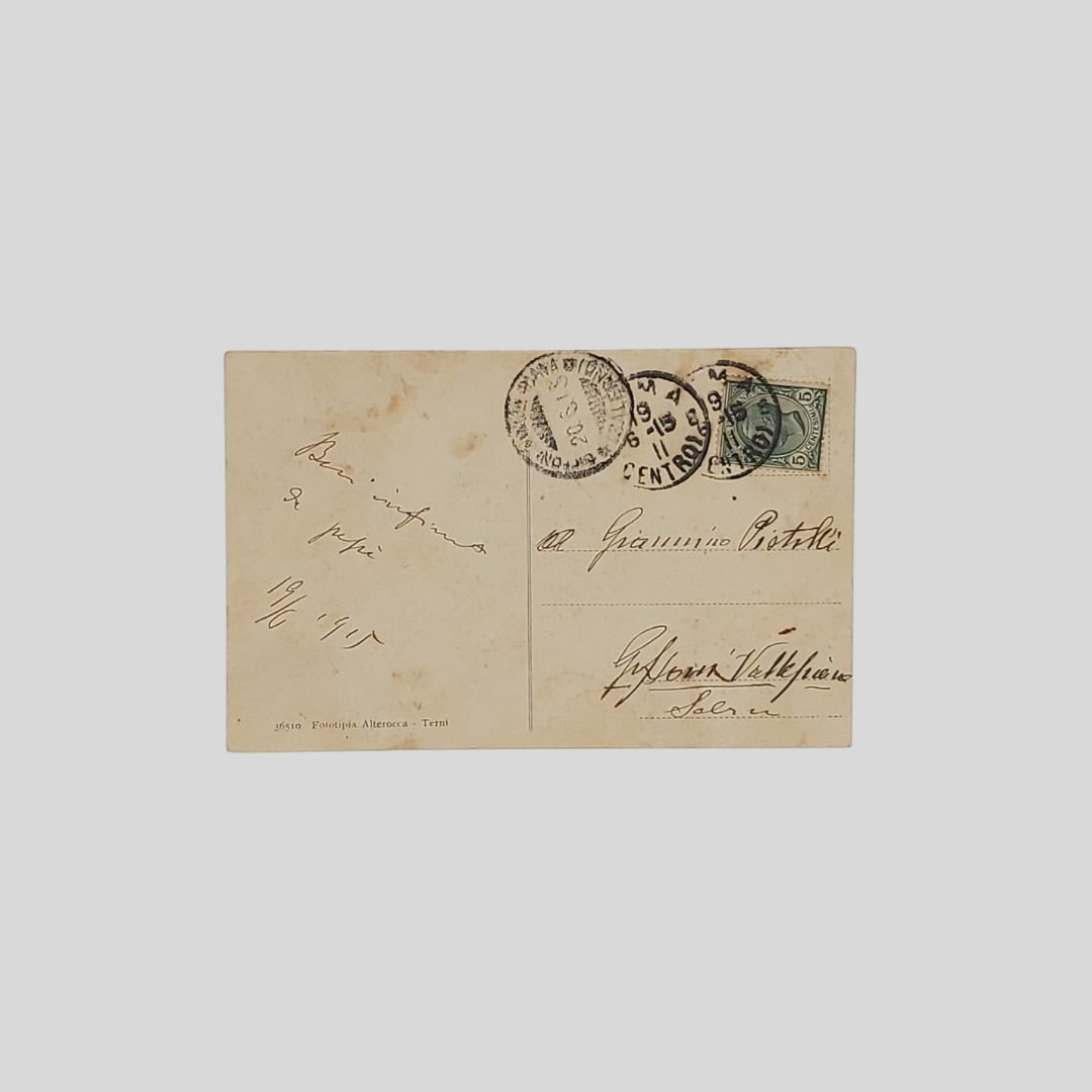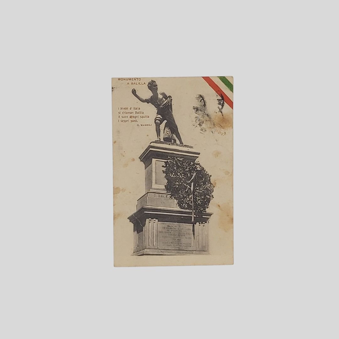 cm 9x14. Cartolina d’epoca patriottica. Viaggiata, invio del 19/6/1915. Francobollo, timbri. Evidenti tracce d’uso e piegatura all’angolo inferiore. Al recto citazione di Goffredo Mameli. Non comune. Monumento a Balilla, da icona patriottica del sacrificio durante la grande guerra a simbolo della propaganda fascista nel successivo ventennio